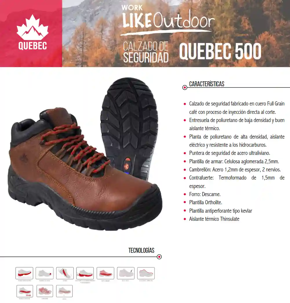 El calzado de seguridad anticlavo Quebec 500 está diseñado para brindar protección y seguridad en entornos laborales. Está fabricado con cuero Full Grain de color café, que proporciona durabilidad y resistencia. Este calzado cuenta con una entresuela de poliuretano de baja densidad, la cual no solo ofrece comodidad y amortiguación, sino que también tiene propiedades de aislamiento térmico. Esto ayuda a mantener los pies protegidos y cómodos, incluso en condiciones de temperatura extremas. La planta de poliuretano de alta densidad es resistente a los hidrocarburos y actúa como aislante eléctrico, proporcionando una capa adicional de seguridad en entornos donde pueda haber riesgo de exposición a sustancias químicas o electricidad. El calzado Quebec 500 también cuenta con una puntera de seguridad de acero ultraliviano, que cumple con los estándares de protección y resistencia. Esta puntera protege los pies de posibles impactos o compresiones, brindando seguridad adicional al usuario. En cuanto a la plantilla interior, está fabricada por la marca Ortholite, conocida por su comodidad y amortiguación. Proporciona una base suave para los pies y ayuda a absorber los impactos durante la actividad laboral. Además, este calzado incorpora una plantilla antiperforante tipo kevlar, la cual protege los pies contra objetos afilados o clavos que puedan estar presentes en el entorno de trabajo. Por último, el aislante térmico Thinsulate proporciona una capa adicional de protección contra el frío, manteniendo los pies cálidos y cómodos en condiciones climáticas adversas.