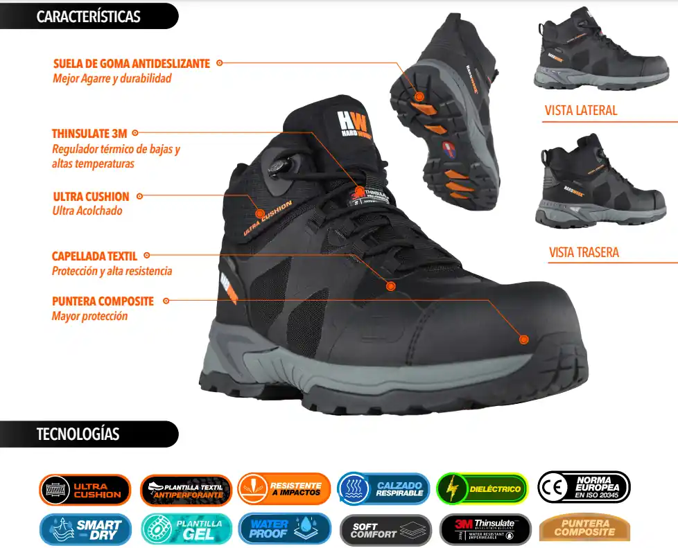 El Calzado Ranger combina seguridad y rendimiento outdoor gracias a su tecnología Ultra Cushion, que ofrece comodidad superior en cada paso. Su diseño ligero, impermeable y transpirable con membrana Smart-Dry mantiene el pie protegido en diversas condiciones. La tecnología Thinsulate 3M regula la temperatura, mientras su plantilla de gel entrega mayor confort. Resistente y confiable, es ideal para trabajar largas jornadas en terrenos exigentes.