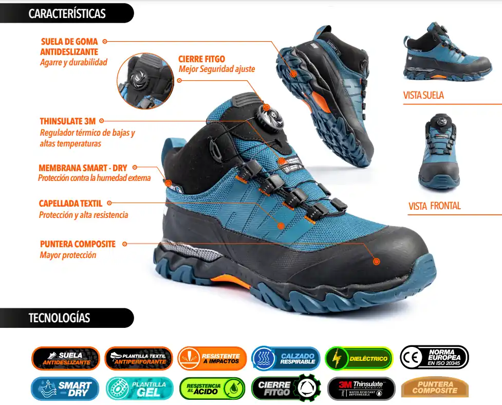 El Calzado Terrain ha sido diseñado con tecnología avanzada para brindarte la mejor experiencia en cada situación. Cuenta con un aislante térmico de Thinsulate 3M de 200 grs que proporciona una protección inigualable en bajas temperaturas. La membrana Smart-Dry ofrece protección impermeable y respirable, manteniendo los pies secos y cómodos en cualquier situación. La plantilla interior con gel es antibacterial, garantizando la higiene y comodidad que necesitas en largas jornadas. Este diseño se complementa con la suela HW PROFESSIONAL que ofrece un extraordinario agarre y antideslizamiento, además de resistencia a la abrasión. Y ahora, con la incorporación de la tecnología FITGO, ajustar y asegurar tu calzado es más fácil que nunca.