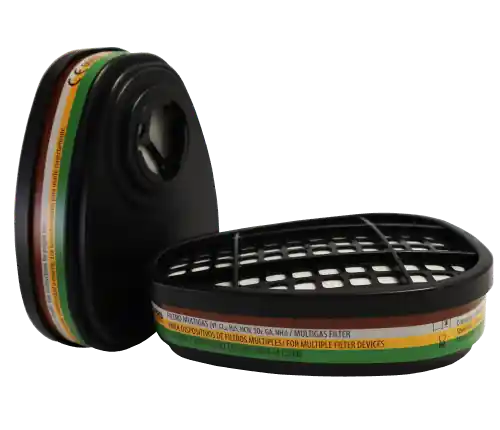 El filtro ERGONIC F500M ABEK1 es un filtro multigas que protege al usuario de vapores orgánicos (VO), dicloro (Cl2), ácido sulfúrico (H2S), cianuro de hidrógeno (HCN), dióxido de azufre (SO2), GA y amoníaco (NH3). Es compatible con los respiradores ERGONIC de medio rostro 100 y 200S, y de rostro completo 1000S.