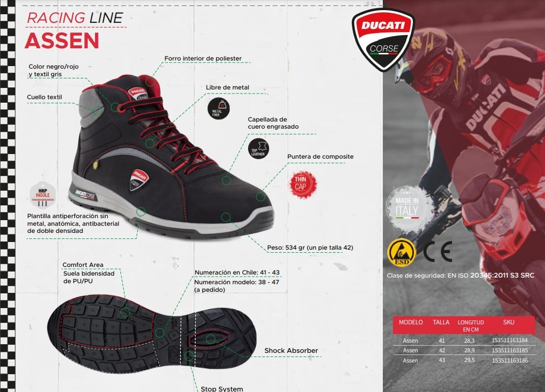 Botín Ducati Assen. Puntera LCT (Light Composite Toe Cap) no metálica, Forro Textil sin costuras interiores. Ultraliviano y metal free